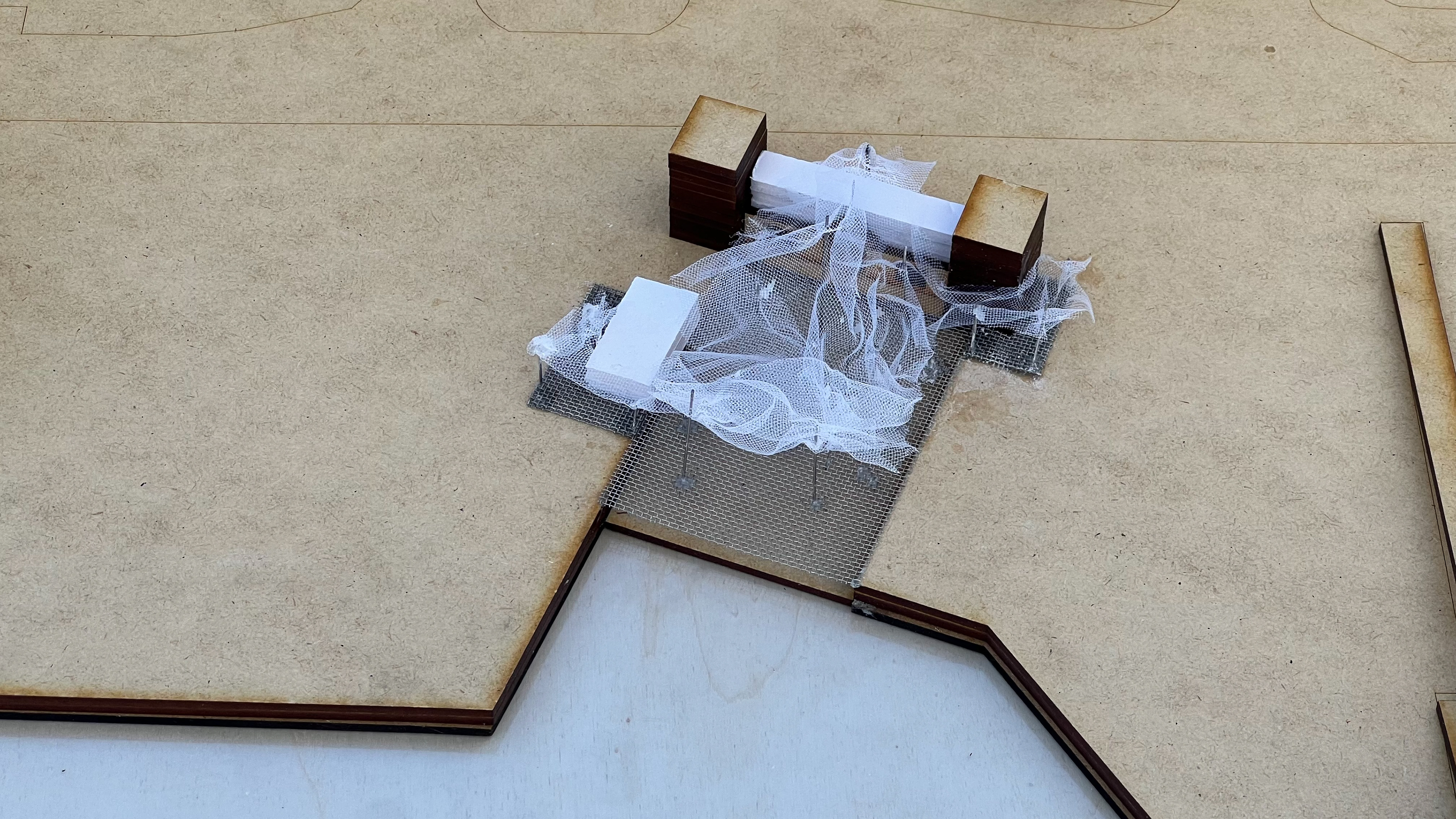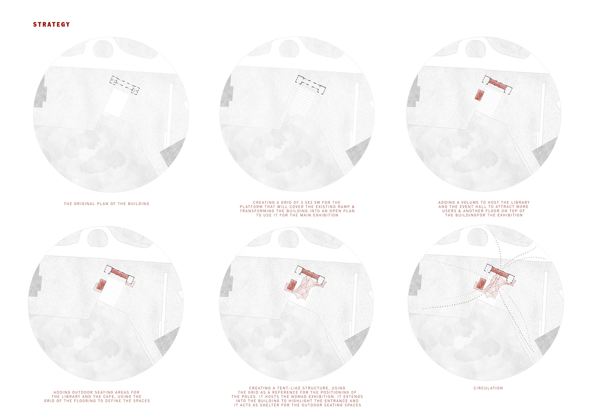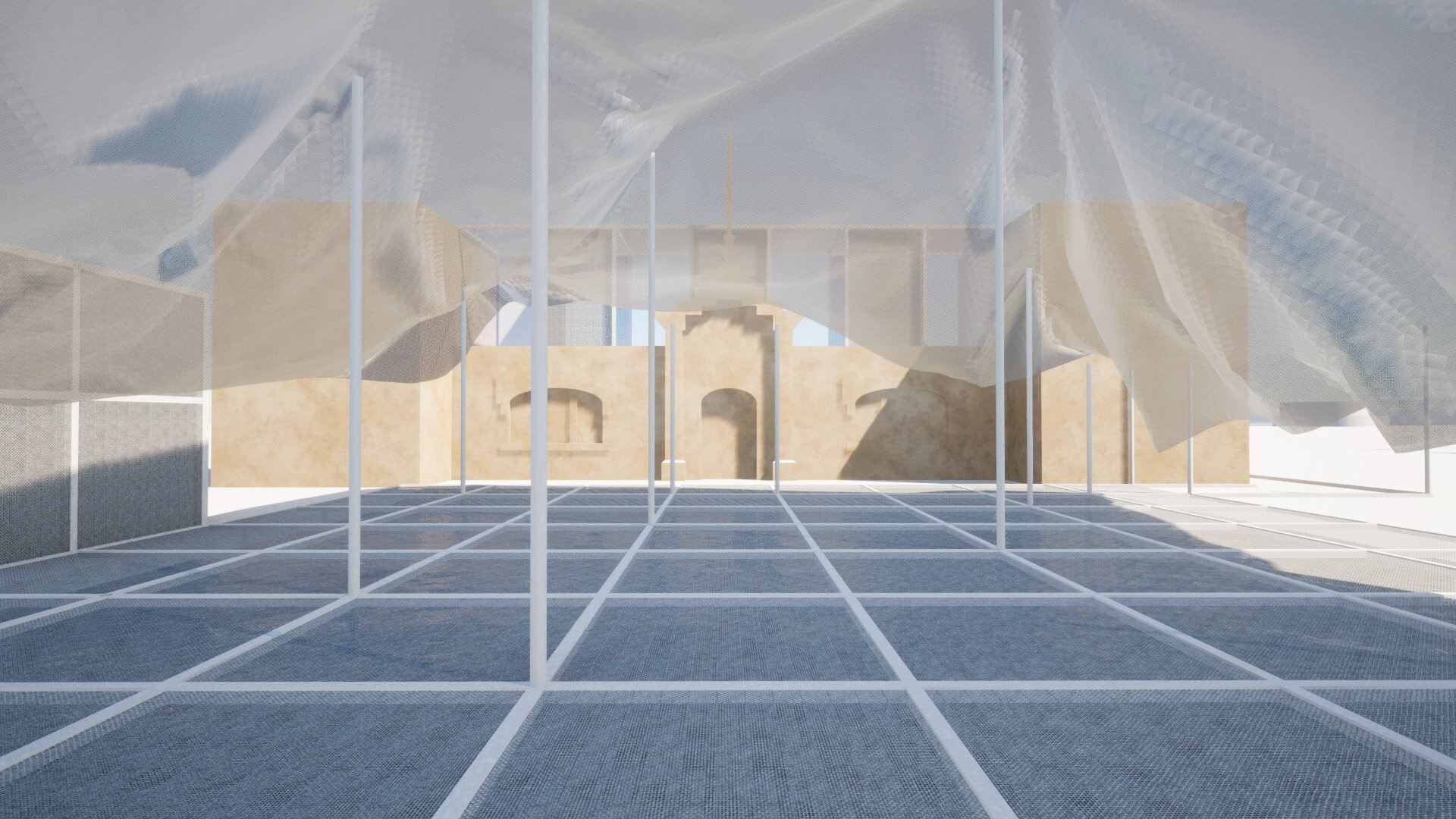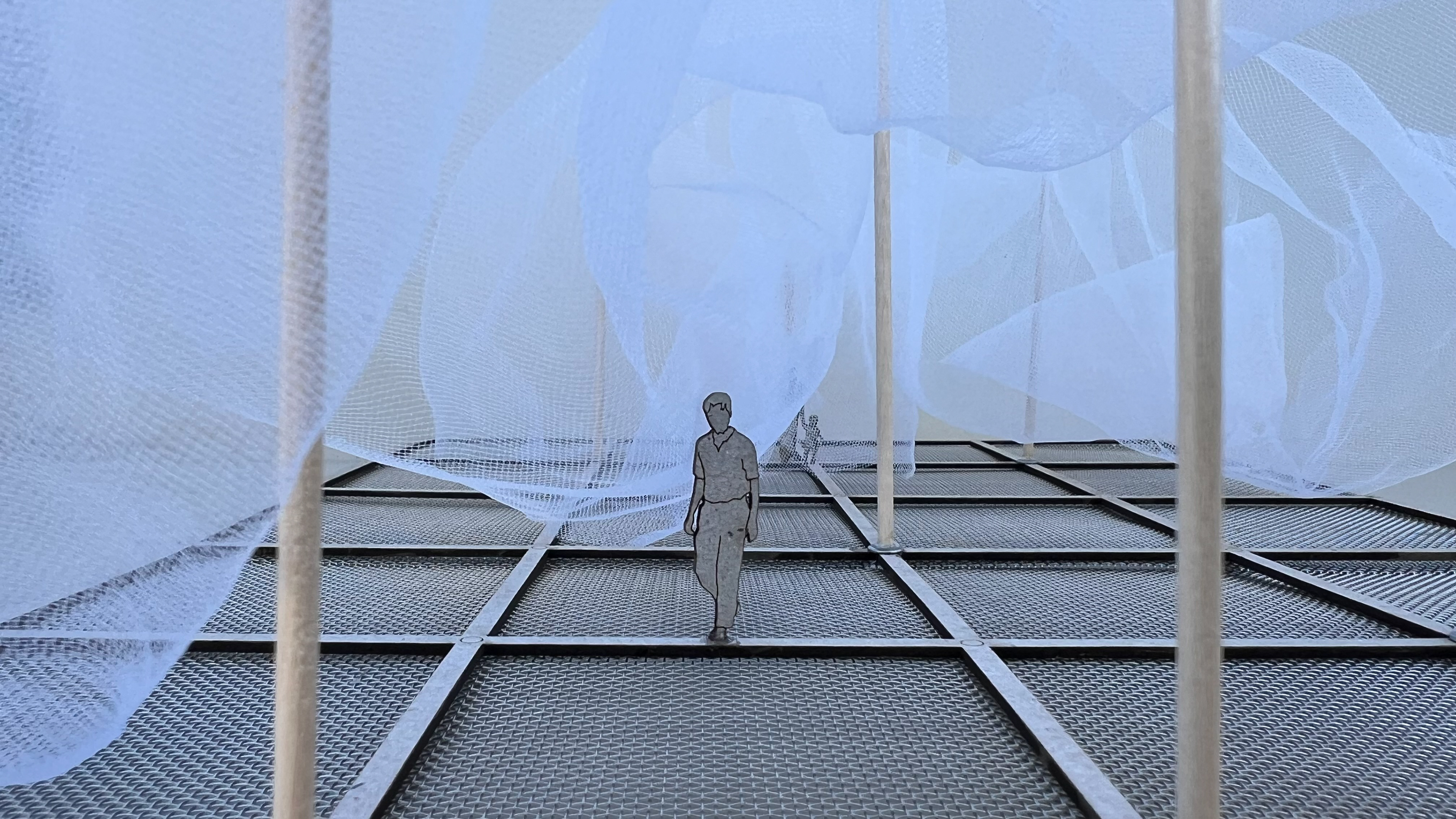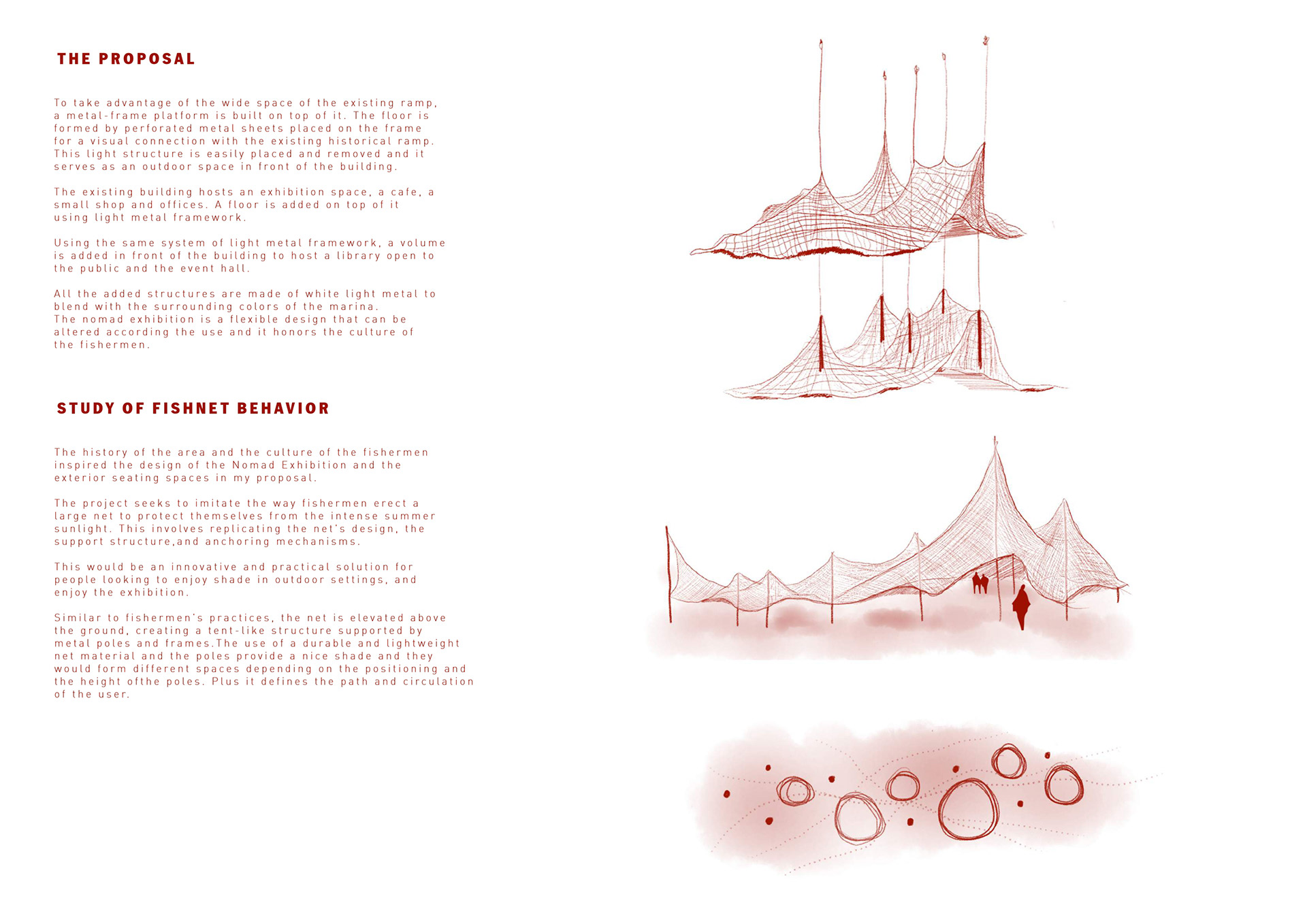 Inspired by the history and traditions of Valencia’s fishing culture, Netscapes proposes a flexible, modular intervention at the city’s marina. By reinterpreting the fisherman’s net as an architectural element, the project introduces a tent-like shading structure suspended by light metal poles, creating fluid, shaded pathways and gathering spaces. The design includes a renovated exhibition building, an added library and event hall, and a metal-frame platform above the historic ramp, all using lightweight, removable structures that preserve the site’s heritage.
