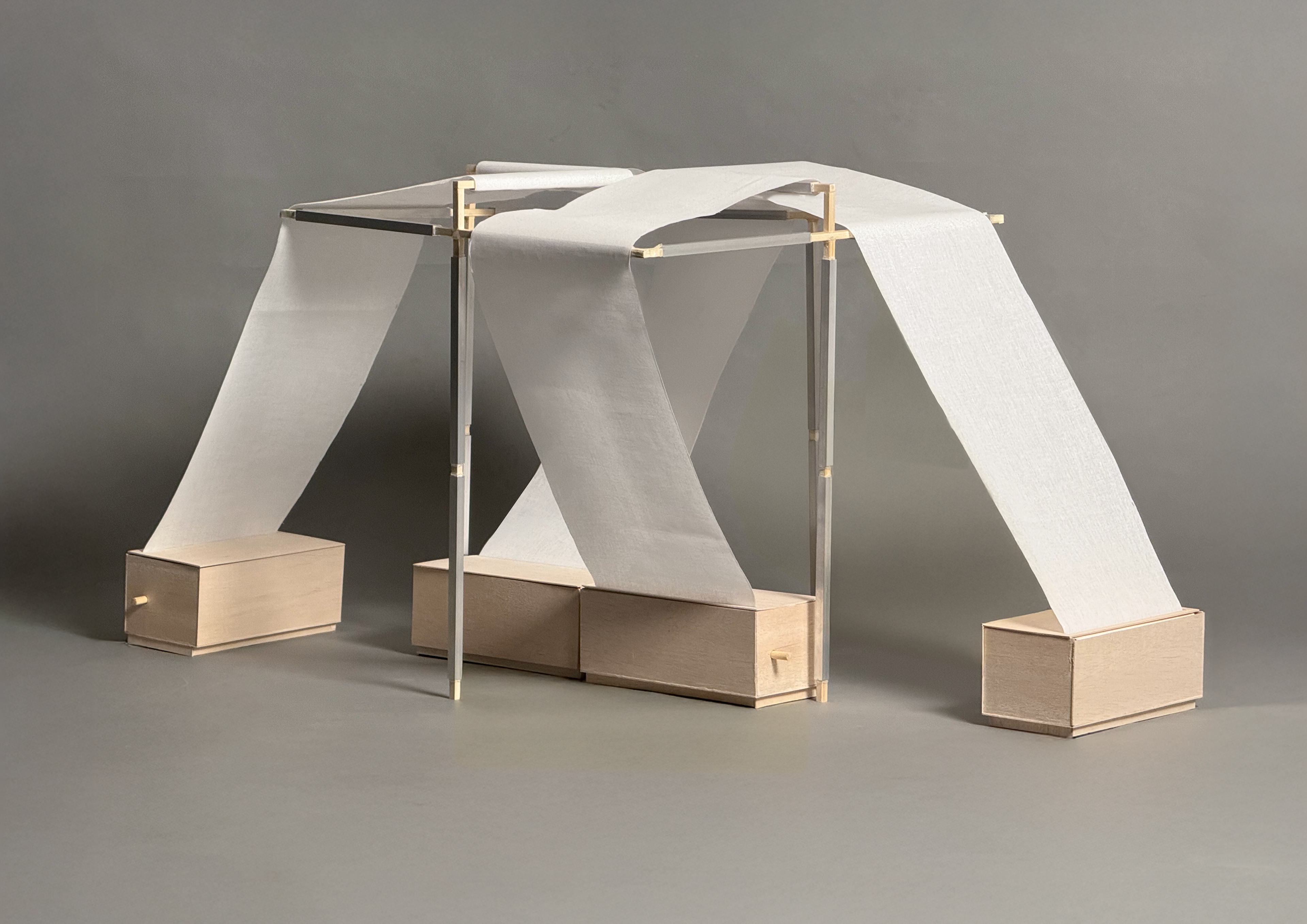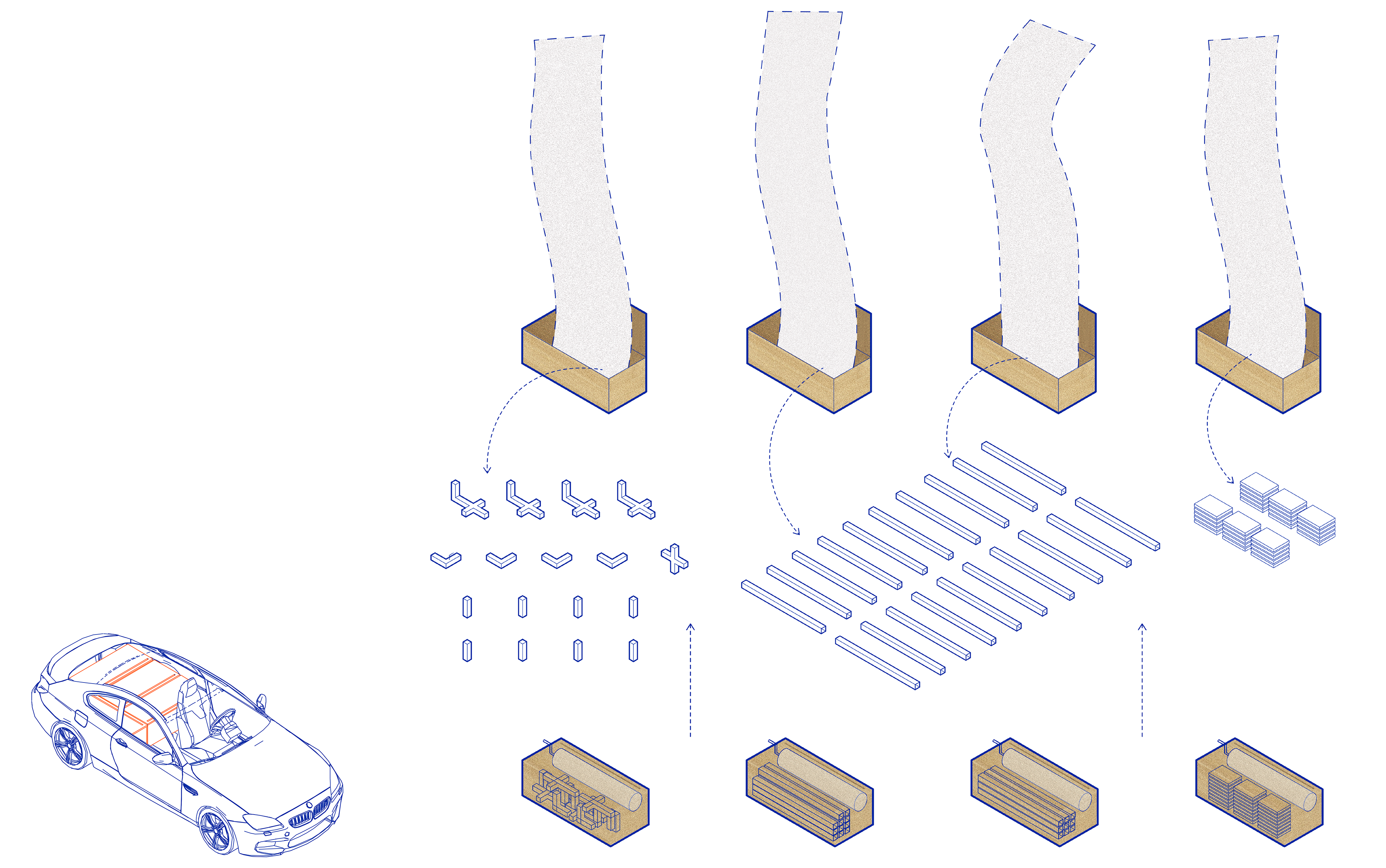 The stand is built entirely from components stored in transportable boxes, which can fit in a standard car. These boxes not only contain all necessary elements but also form part of the stand’s structure, supporting the fabric and enabling various spatial configurations, even extending beyond the main structure. The fabric is rolled inside the boxes and can be pulled out to create the canopy, adapting to different uses depending on its position. This flexibility allows for a dynamic, expanding space.