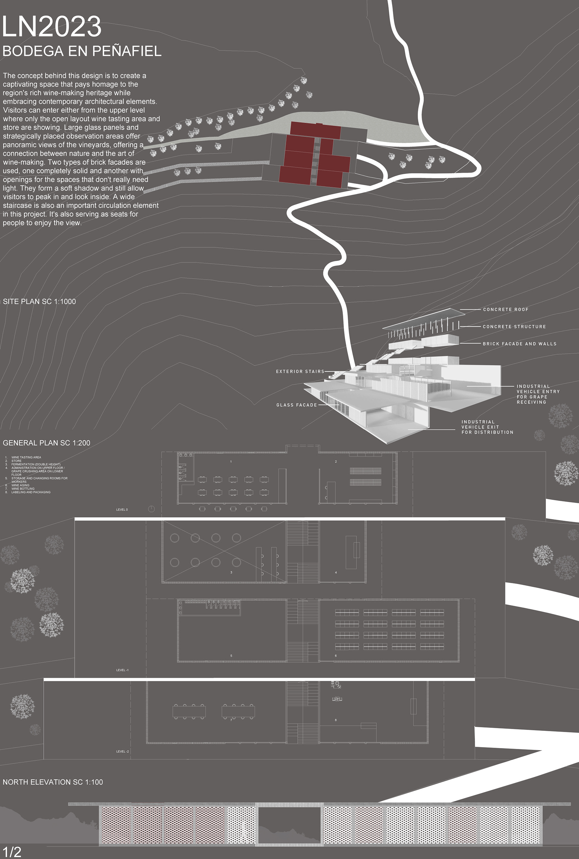 This winery design blends the region’s wine-making heritage with contemporary architecture. Positioned within the landscape, it offers two access levels, the upper for wine tasting and views and the lower for production. Visitors are guided through panoramic observation points framed by large glass panels and brick facades, one solid, one perforated that filter light and reveal glimpses inside. A central staircase serves both as a circulation route and informal seating area, encouraging people to pause and enjoy the vineyard views.